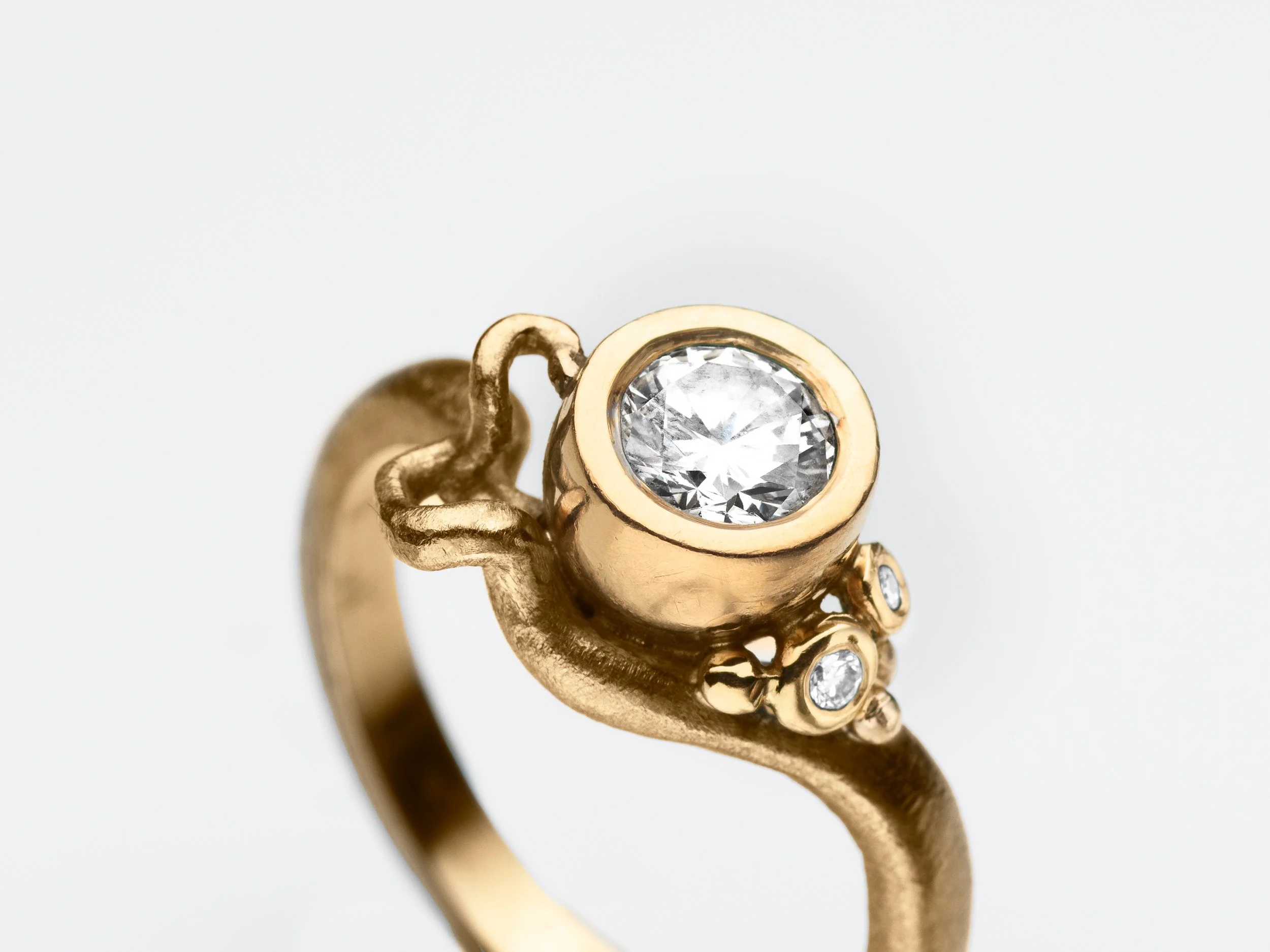 Sculpted from recycled gold, these earrings echo the gentle curve of a falling drop, carrying the essence of life and flow. At the center of each form, a diamond set in white gold sparks intensively, a vivid light held within.